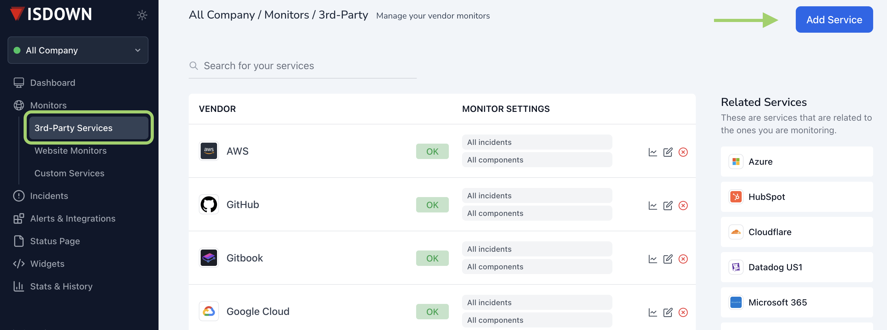 Set up monitoring for external services with IsDown to get notified whenever they experience outages or disruptions.