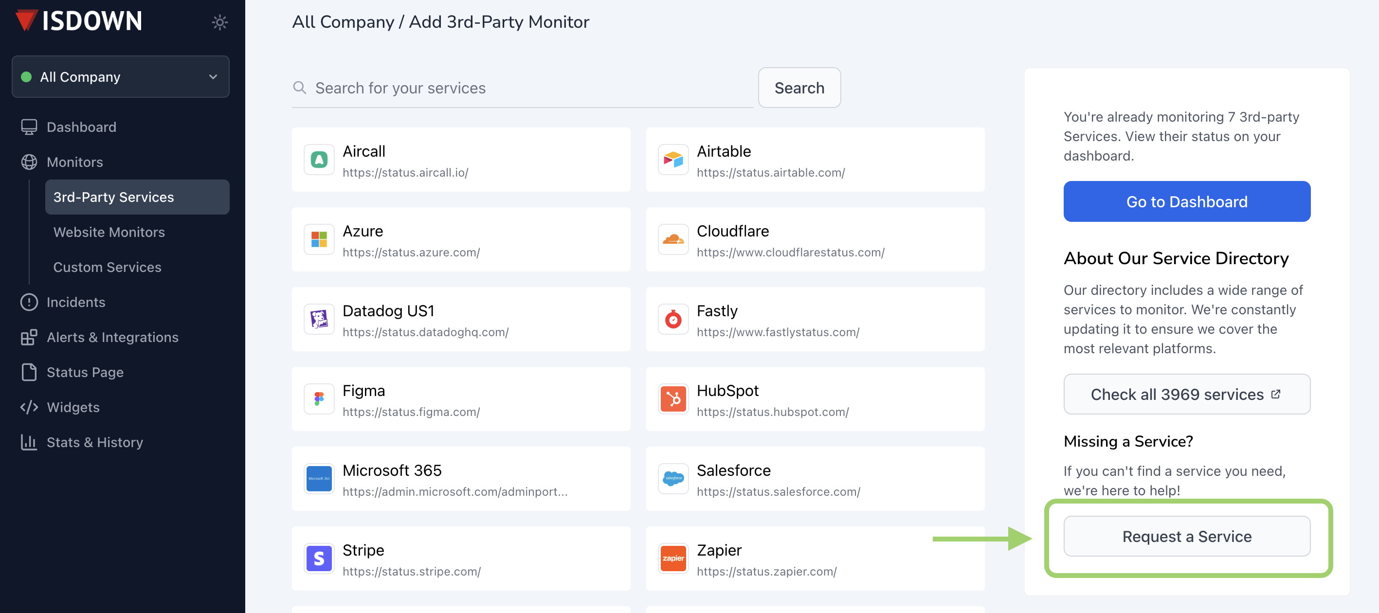 4. Finally, click on "**Request a Service**" to open a pop-up where you can enter and submit the name of the service you'd like us to add.