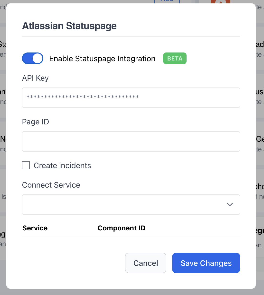 * Select the services you want to connect. To make the connection, we need the component ID, which you can get via the URL of the components in Statuspage.io.