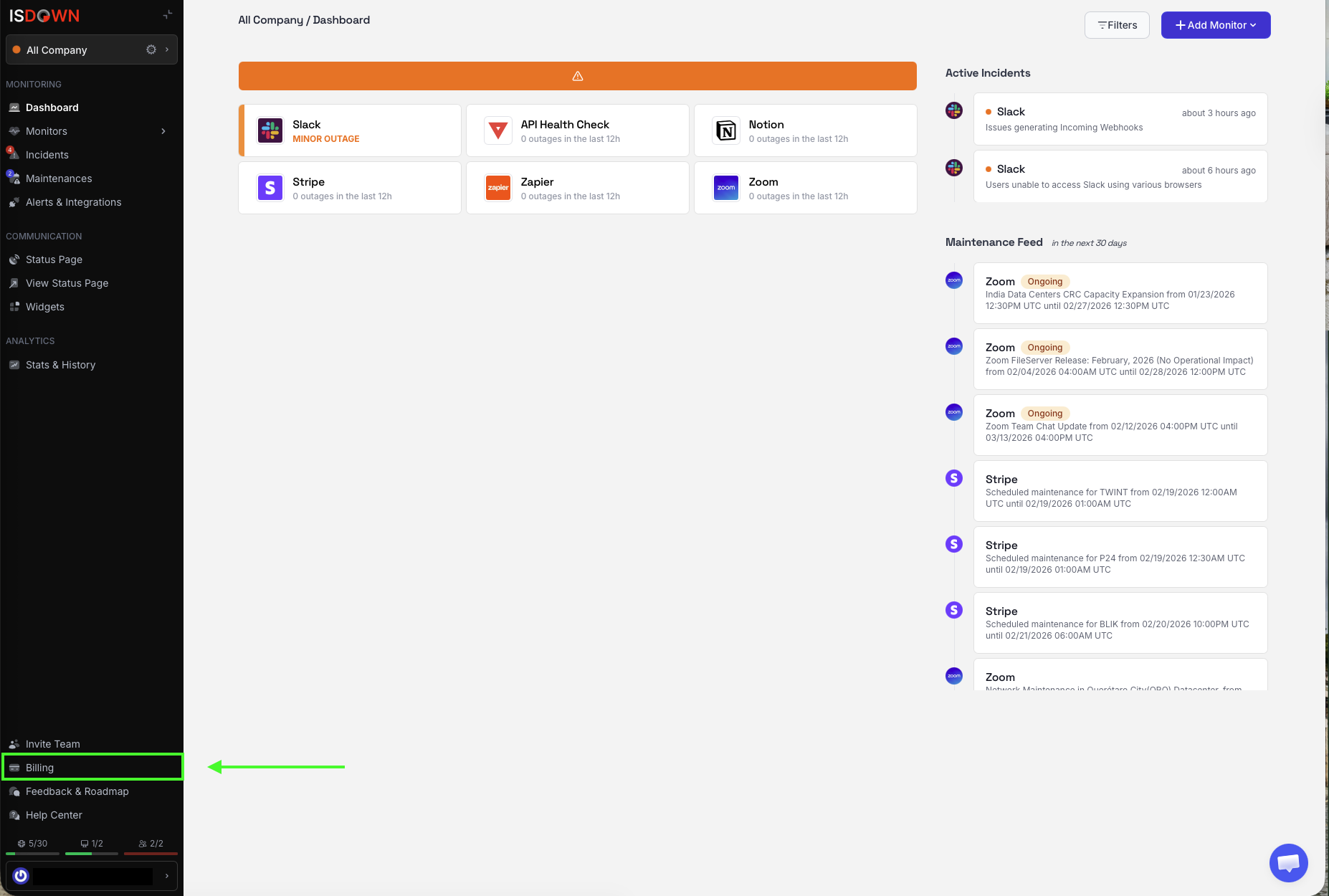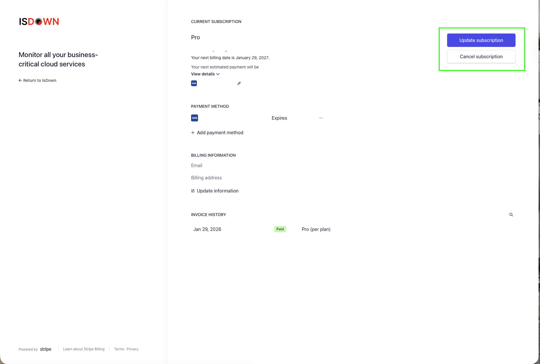 Changing your plan in IsDown is simple and flexible. You can upgrade immediately or schedule a downgrade for the end of your billing cycle.