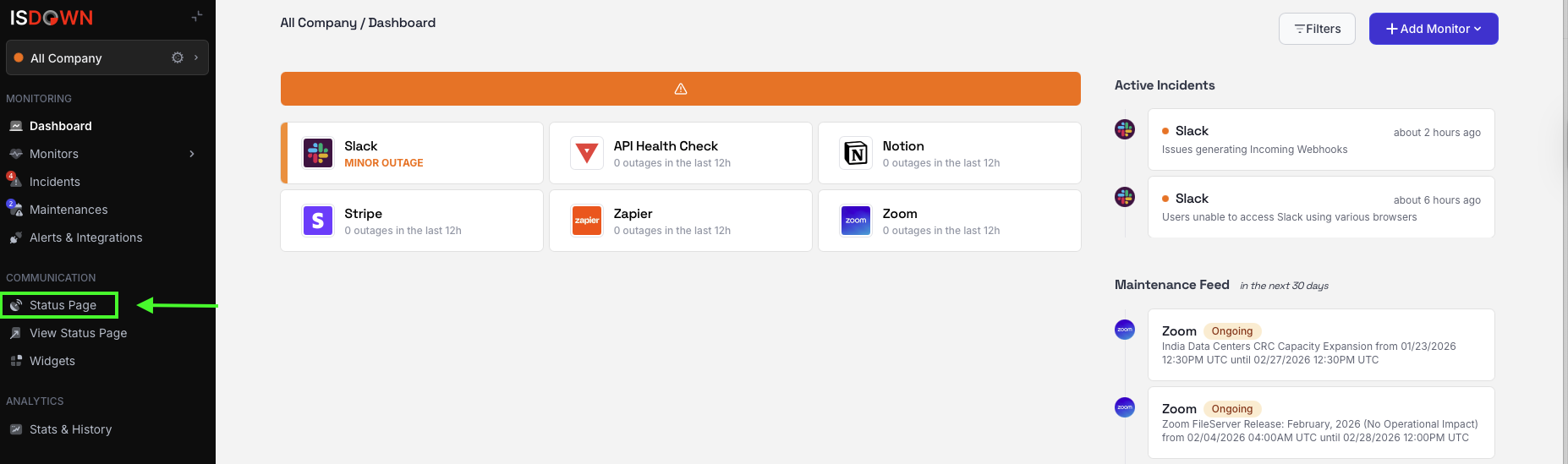 * [**Add Custom Domain**](https://help.isdown.app/status-page/add-custom-domain)