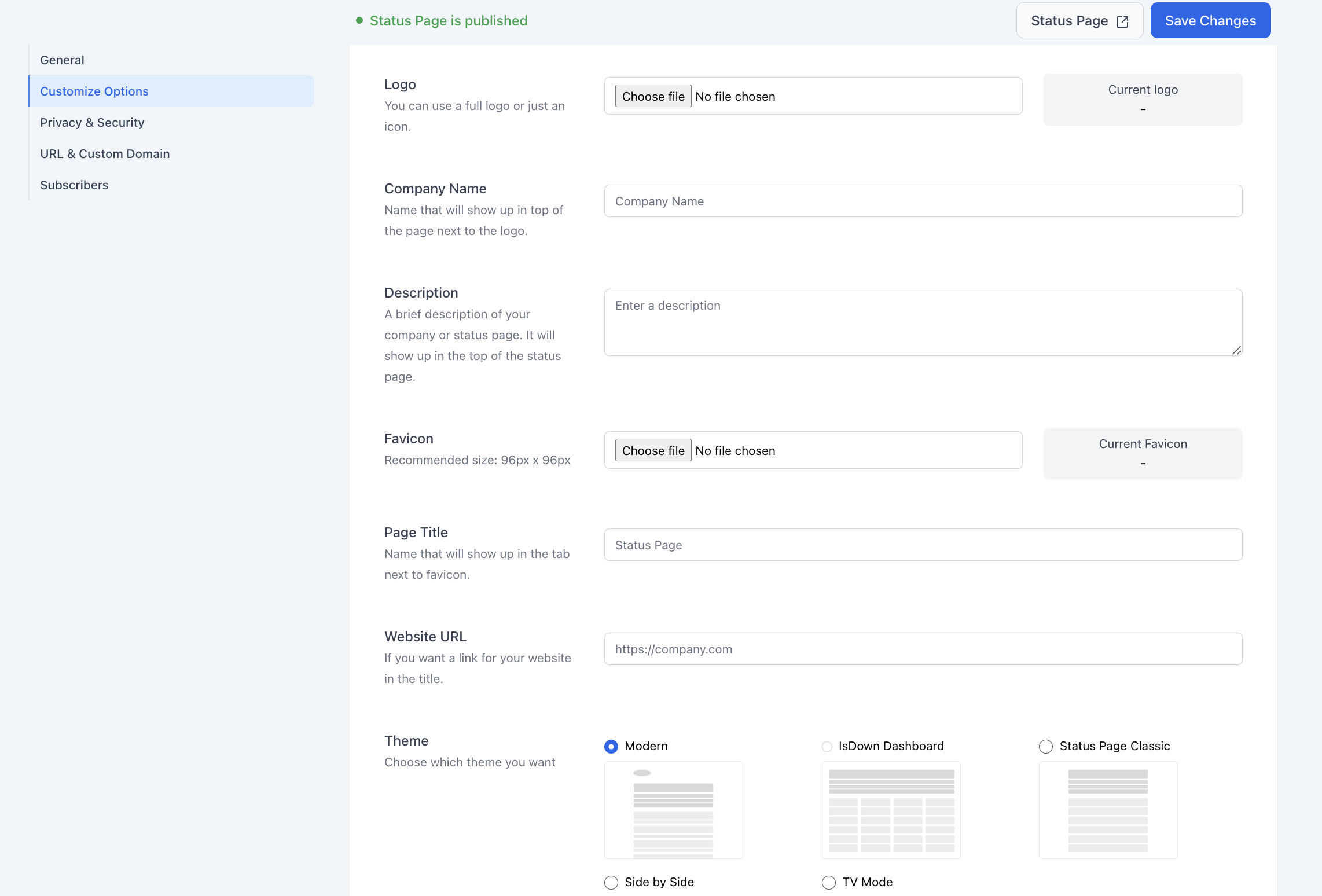 2. Navigate to the **Status Page** section and click on **Customize Options**, where you can adjust the following settings: